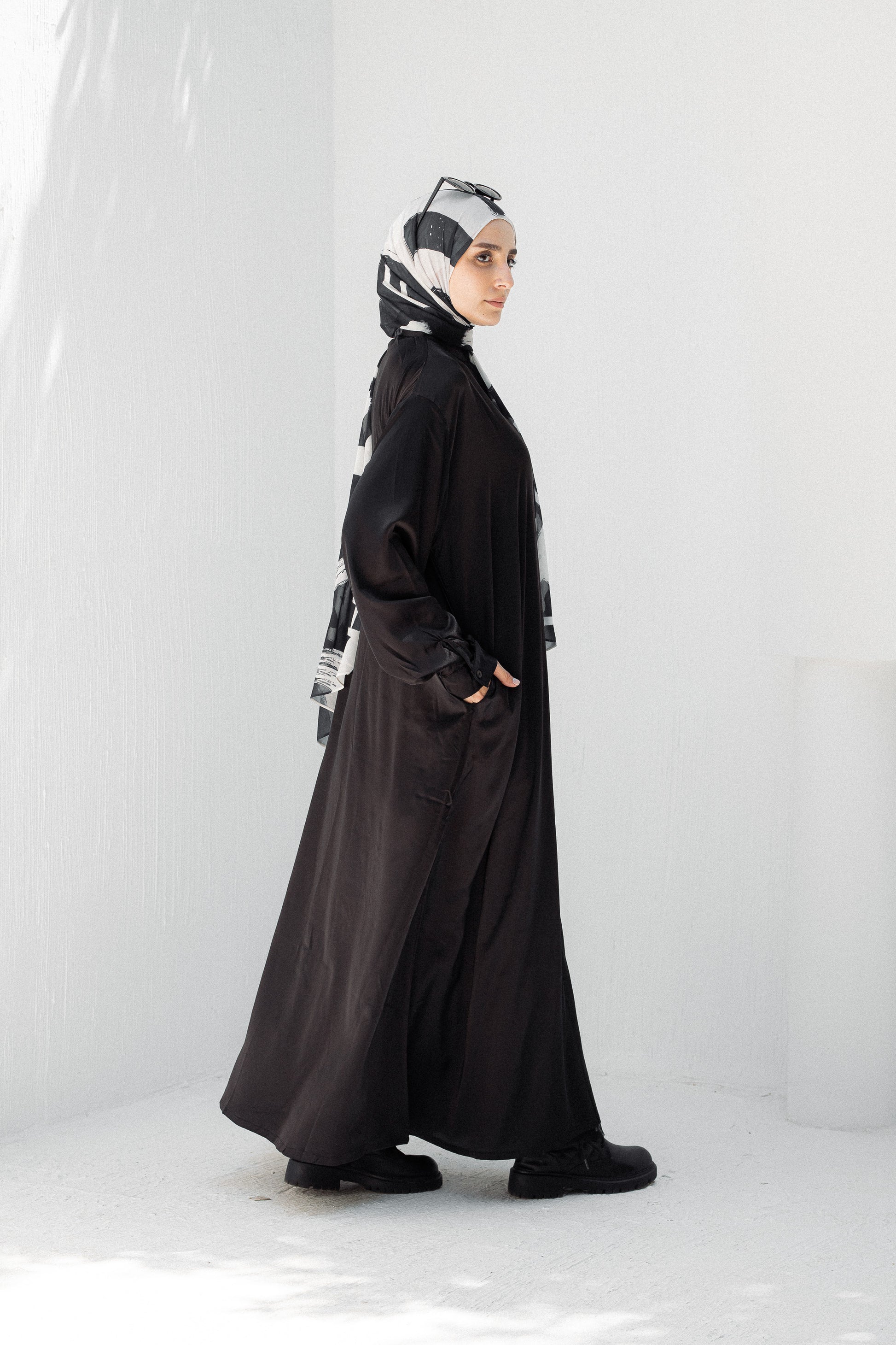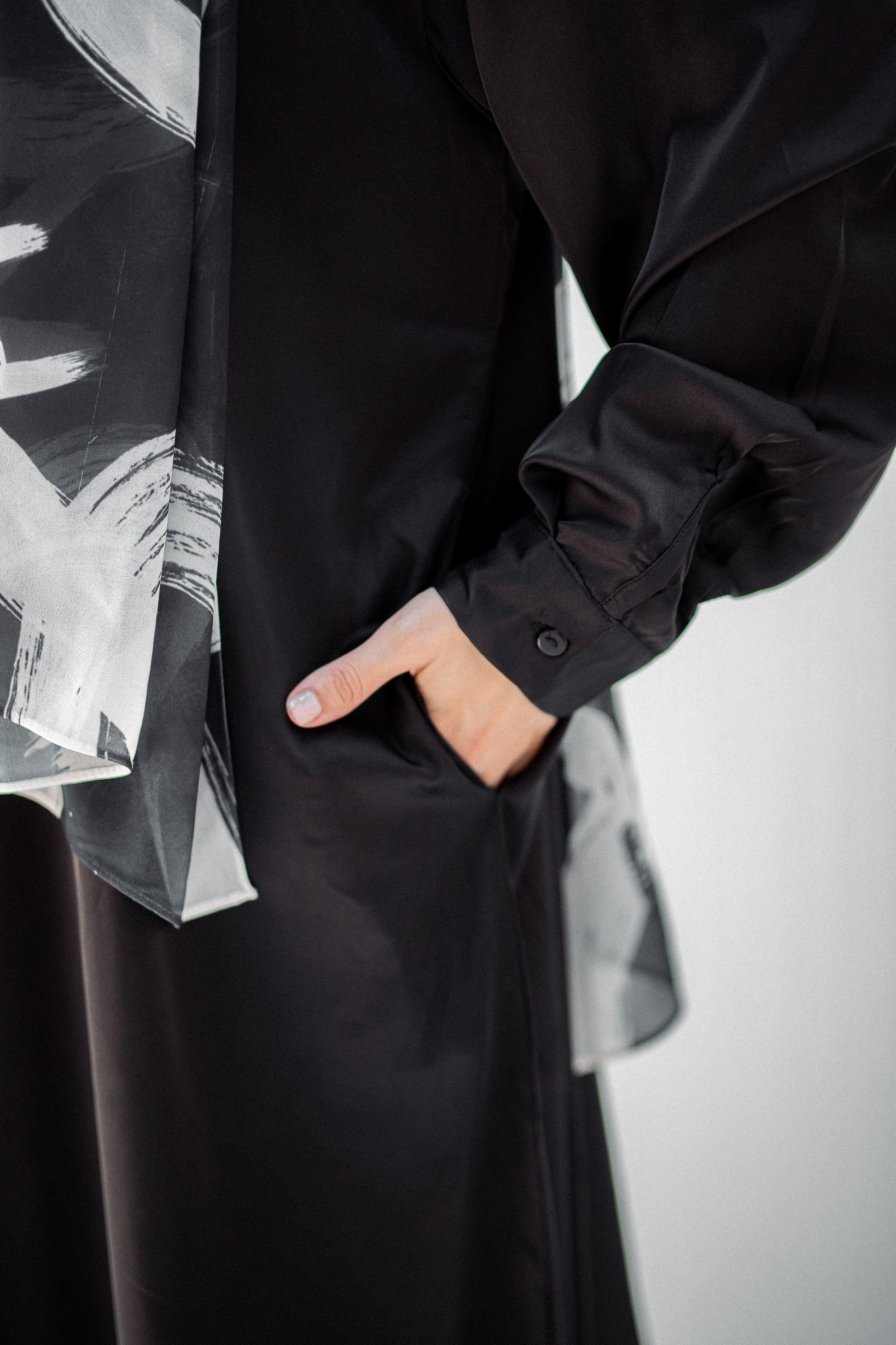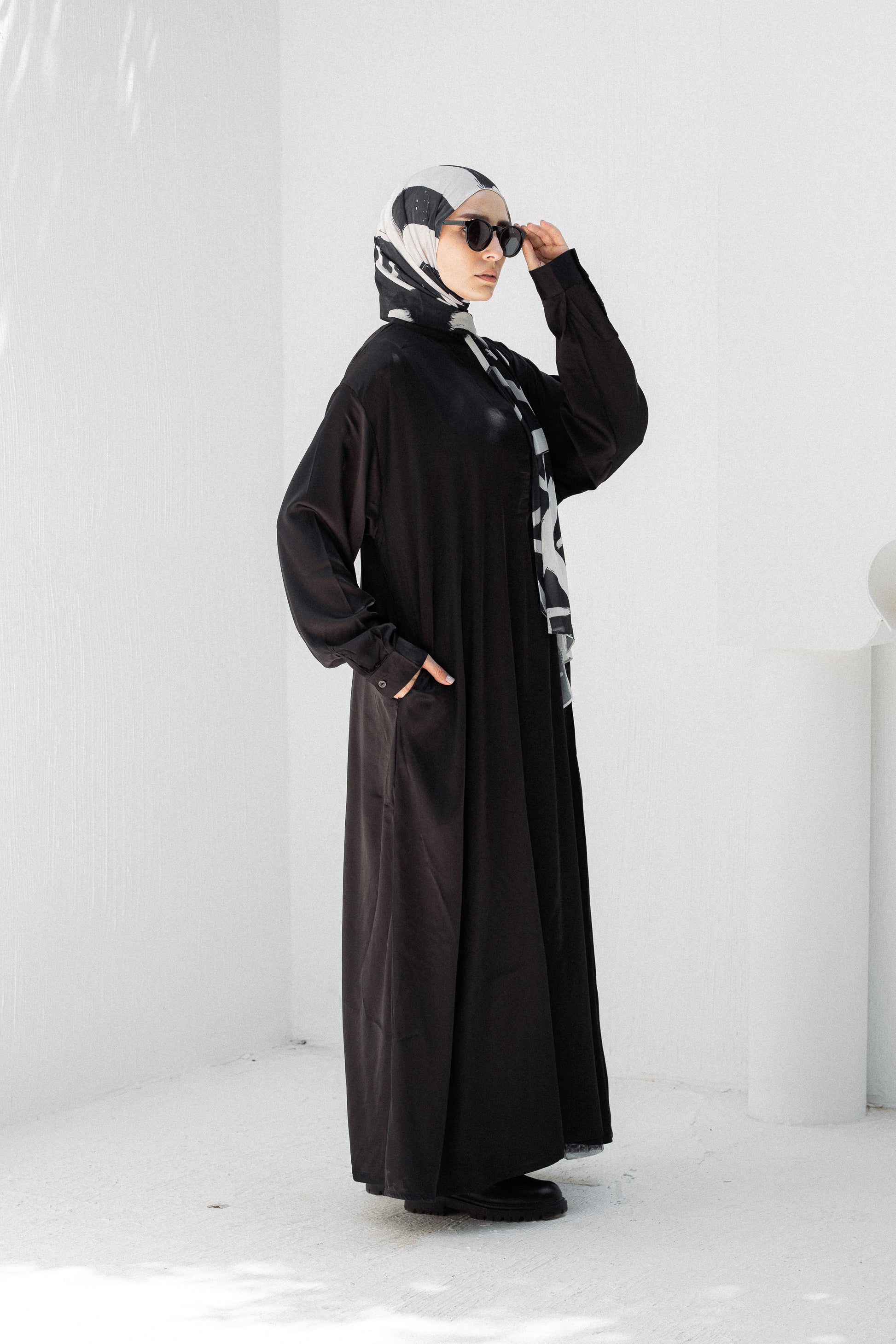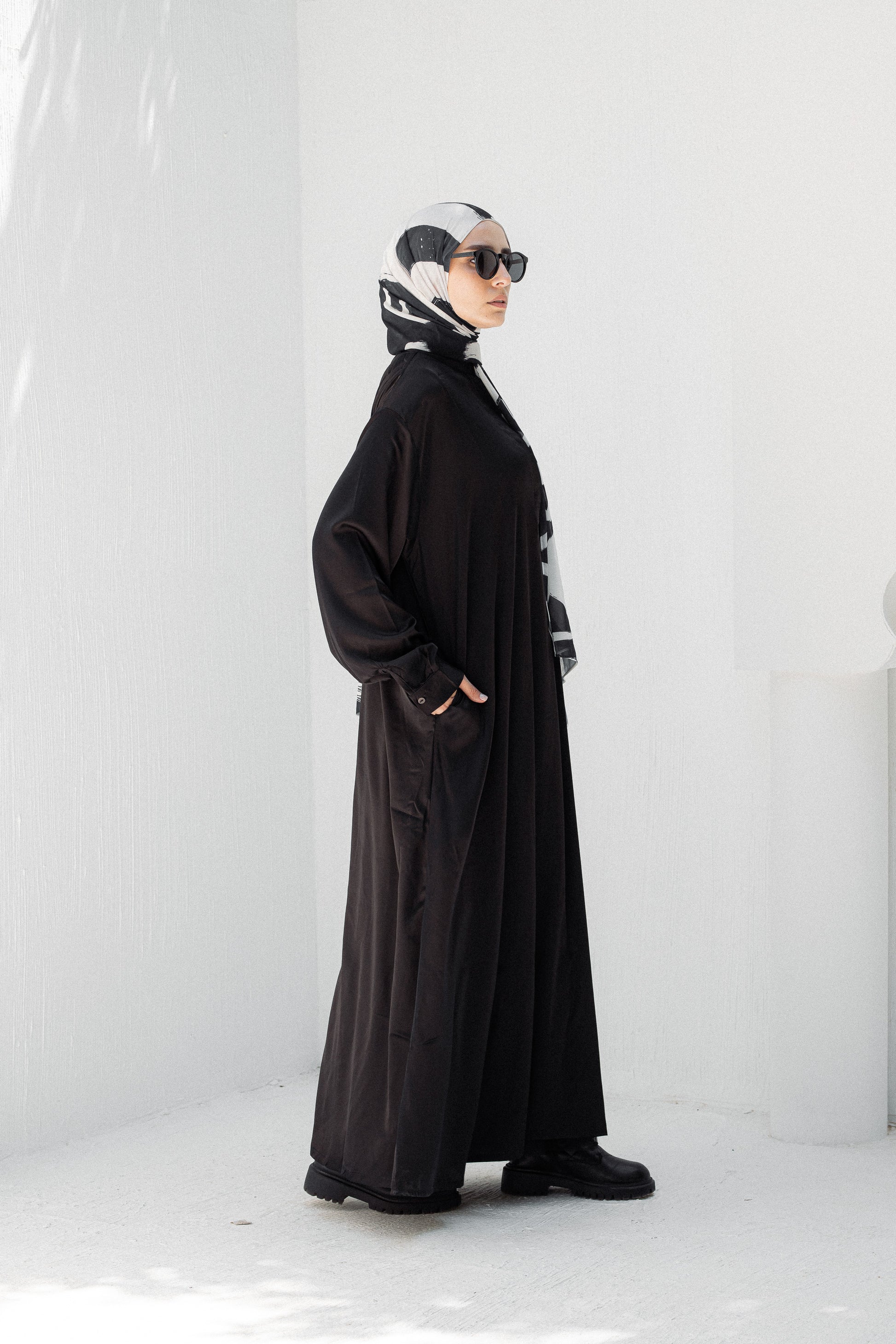 A flowy design made from satin lycra fabric, offering a soft and elegant look. Detailed with front buttons, practical side pockets, and cuffed sleeves for a refined touch of style and comfort. An ideal choice for a graceful appearance that suits various occasions.