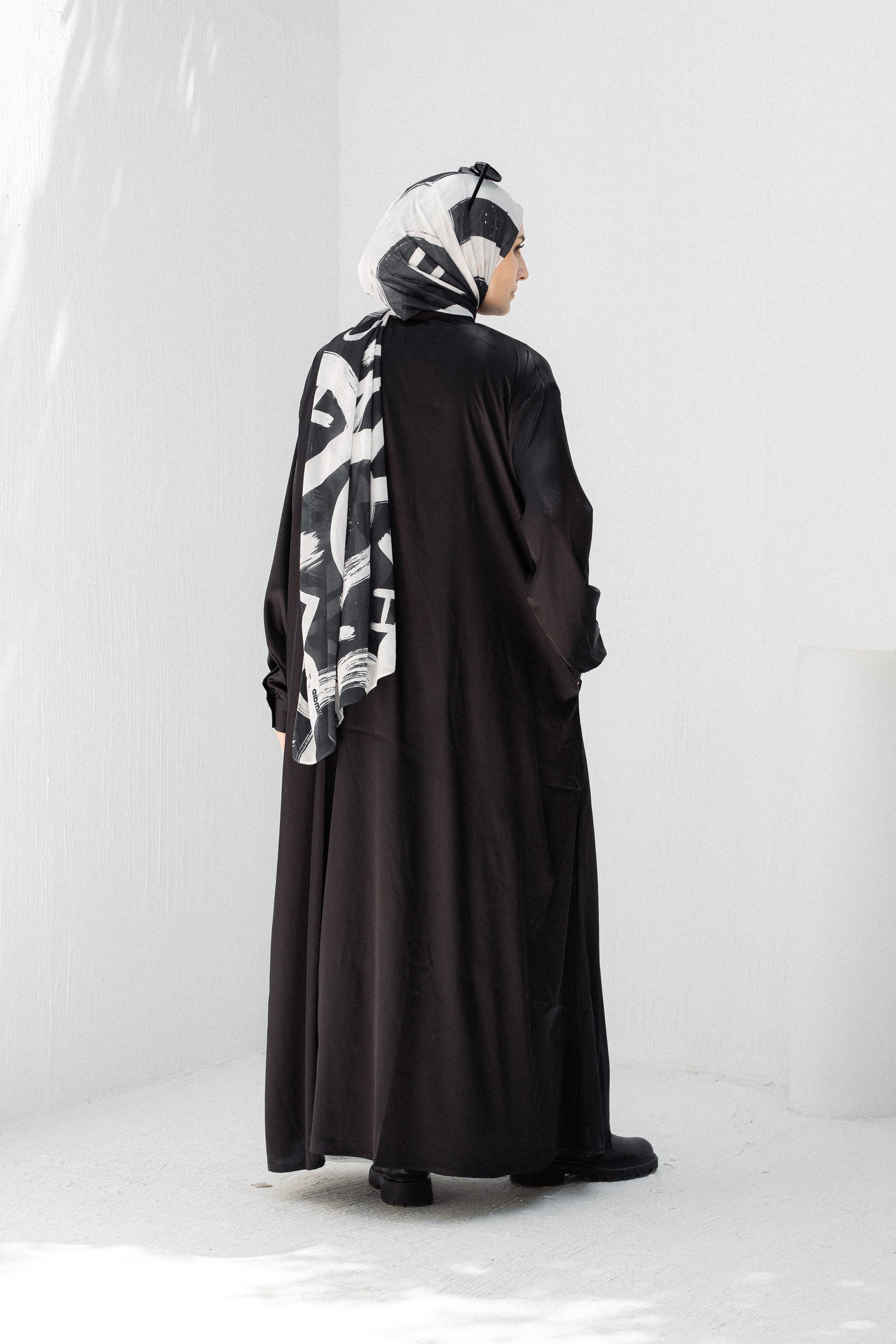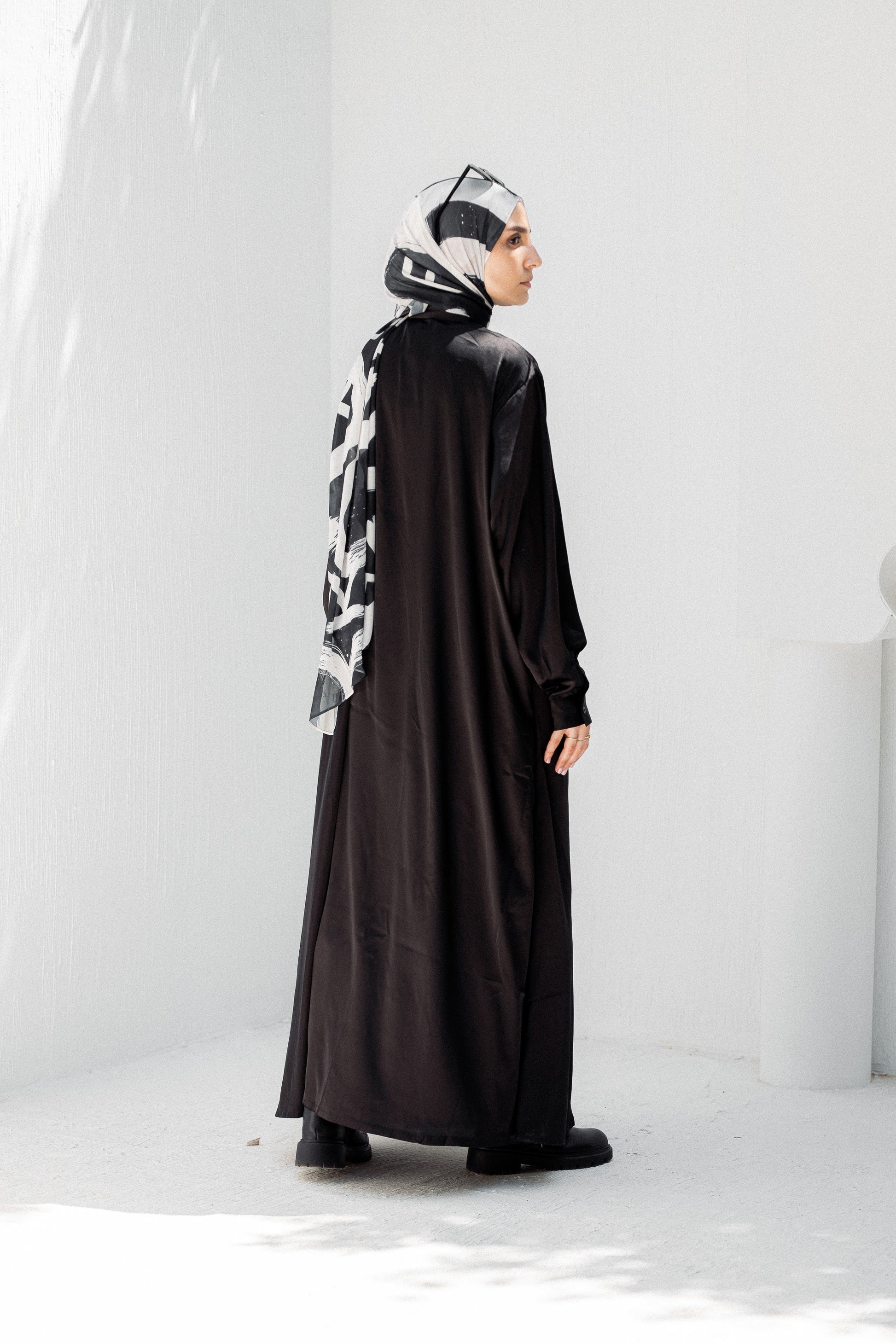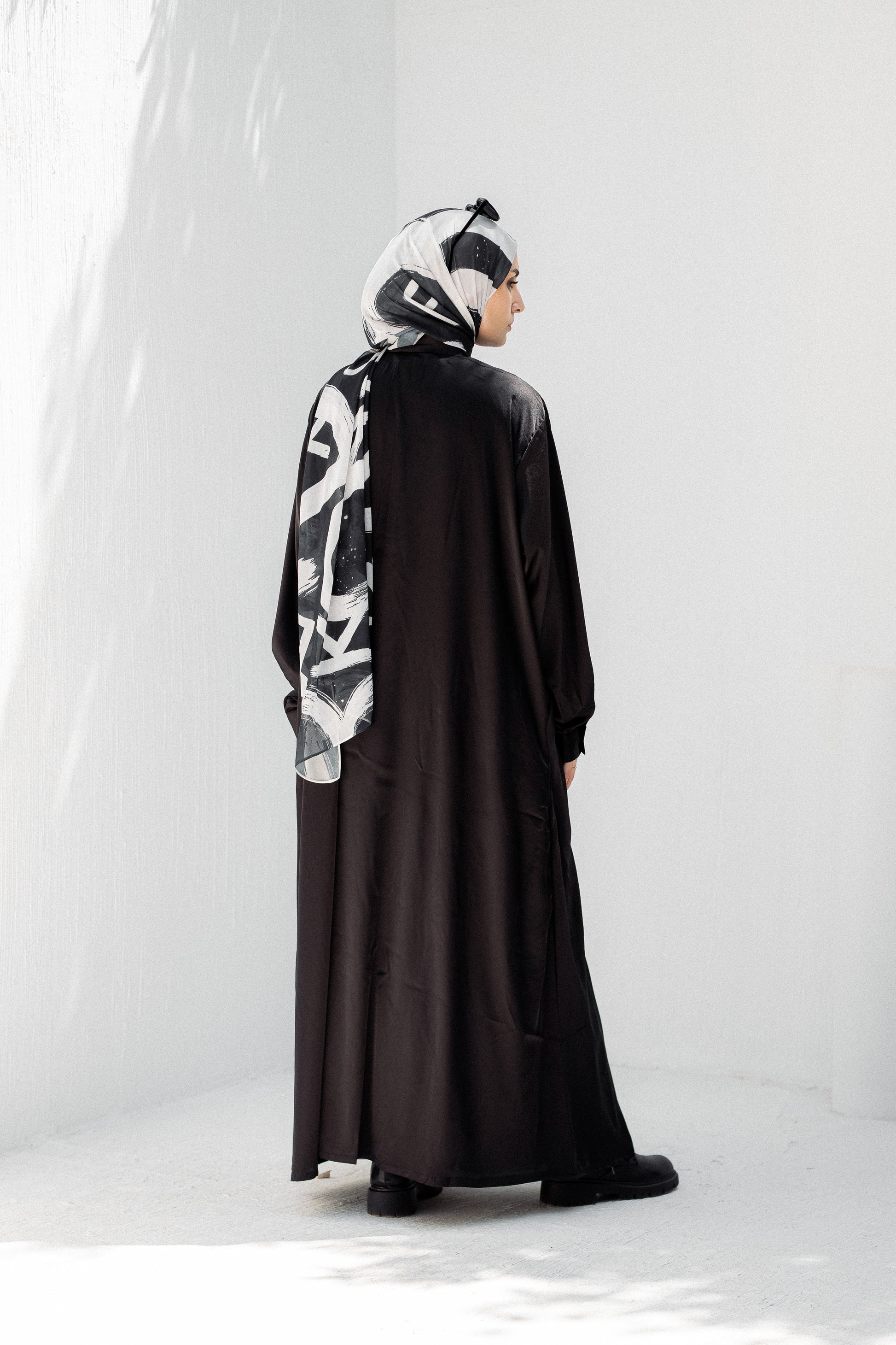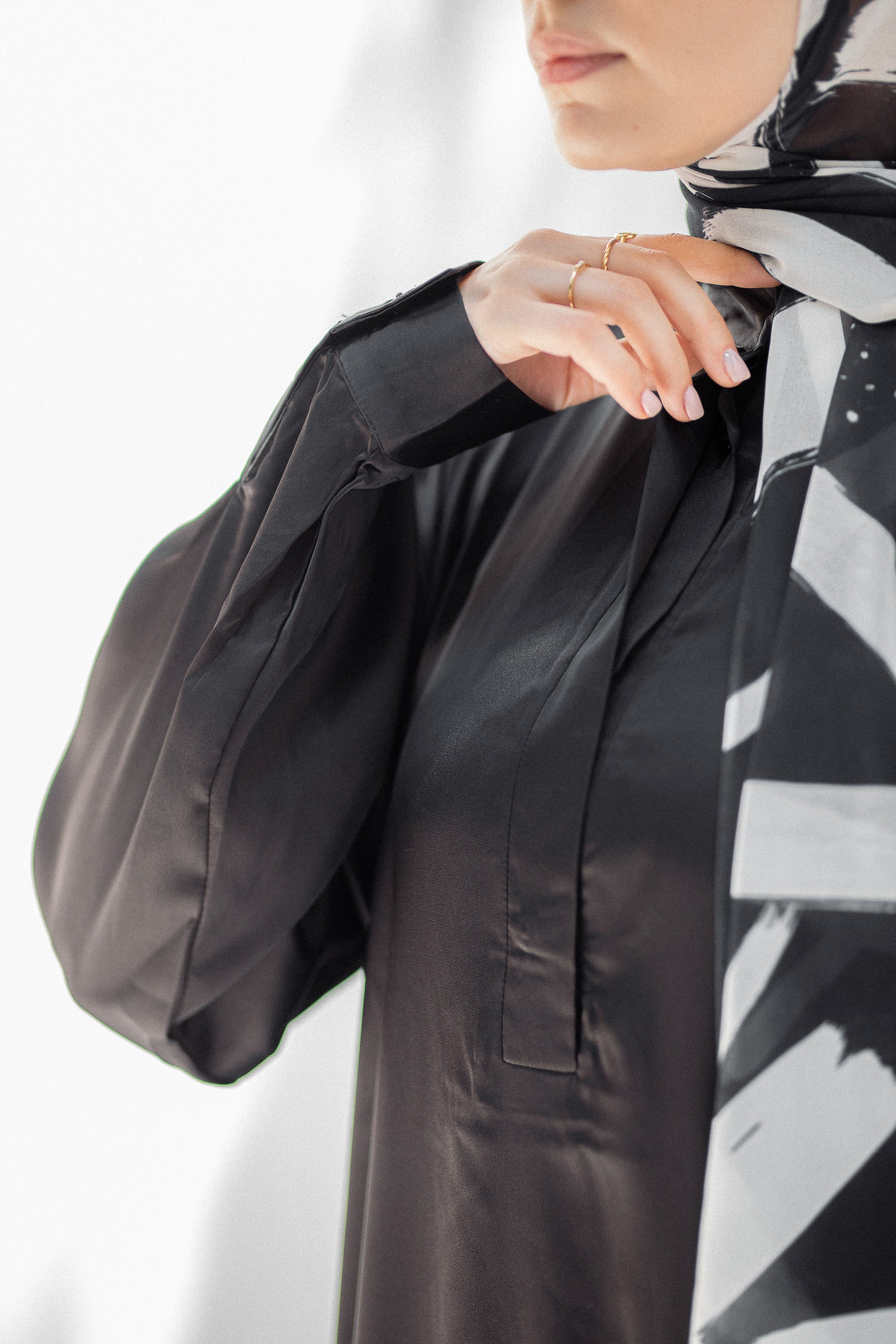 A flowy design made from satin lycra fabric, offering a soft and elegant look. Detailed with front buttons, practical side pockets, and cuffed sleeves for a refined touch of style and comfort. An ideal choice for a graceful appearance that suits various occasions.